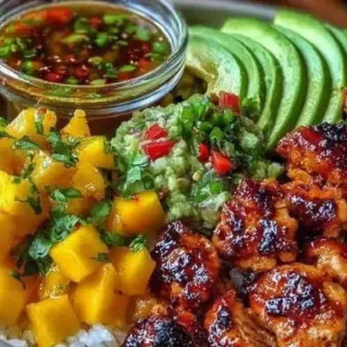 This bowl is a quick, bowl-based meal built around BBQ-marinated chicken, warm jasmine rice, fresh mango salsa, creamy spicy sauce, and avocado. The chicken is lightly sauced with BBQ and spices, giving it a smoky-sweet flavor and caramelized edges. The mango salsa adds bright, juicy contrast with lime and cilantro, while the spicy mayo brings a smooth, tangy finish. Cooking is simple: toss, sear, mix, and assemble. The vibe is casual comfort food with a fresh, summery twist—perfect for weeknight dinners, meal-prep lunches, or a relaxed weekend meal with friends.