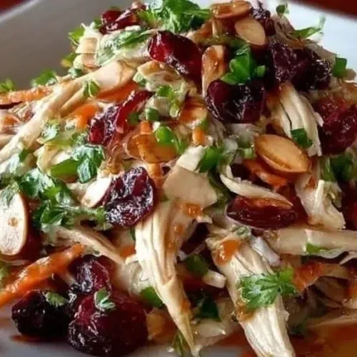 Asian Chicken Cranberry Salad is a cold mixed salad built on shredded cooked chicken and crunchy vegetables with dried cranberries and sliced almonds for texture. The dressing is an Asian-inspired mix of soy sauce, honey, rice vinegar, sesame oil, and fresh ginger. It tastes sweet, salty, and slightly tangy with a mild sesame note. The salad is special because it pairs familiar American salad elements (dried cranberries, almonds) with a light Asian dressing for a modern crossover flavor. It’s an easy, no-cook assembly dish that fits weeknight dinners, light lunches, potlucks, or a casual brunch vibe.