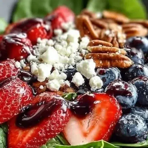 This is a simple fresh salad built on a bed of fresh spinach and loaded with berries, thin red onion slices, crumbled feta, and toasted pecans. The balsamic is simmered down into a sweet, syrupy glaze and drizzled over the salad just before serving. Taste-wise, you’ll get sweet berries, briny feta, toasty nuts, and rich balsamic all in one bite. The cooking method is mostly no-cook—just a short reduction for the glaze—so it has a fresh, light vibe perfect for spring or summer lunches, brunch, or an easy weeknight side that still feels special.