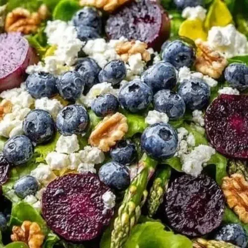 This fresh salad mixes green leaves, bright vegetables, and soft goat cheese. It is quick to make and looks nice on a spring table. If you want a warm main to go with it, try this Peruvian chicken with creamy green sauce as a simple pairing.