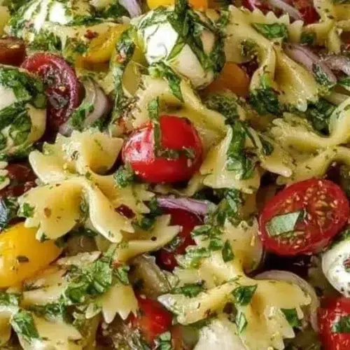 Bow tie pasta salad is bright, creamy, and easy to eat—soft cooked bow tie pasta, juicy halved cherry tomatoes, tender spinach, little bocconcini balls, and fresh basil all tied together by a simple pesto-lemon dressing. The texture is a nice mix of chewy pasta, soft cheese, and crisp-tender veggies, while the pesto and lemon give a fresh, bright flavor that feels light but satisfying. It’s a fast, no-fuss dish you can toss together for a quick lunch, bring to a picnic, or serve as a side at a weeknight dinner. The recipe uses pantry-friendly items and only a few minutes of hands-on time after the pasta is cooked, so it’s perfect when you want something wholesome without a lot of work. For a heartier plate, pair it with grilled chicken or try a warm version by gently heating the cooked pasta before adding the toppings. For a different savory idea, check this related recipe: creamy garlic parmesan beef bowtie pasta.