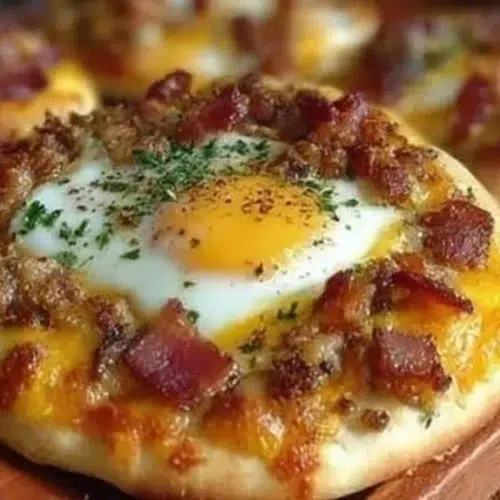 This quick and tasty Breakfast Pizza features toasted English muffins topped with scrambled eggs, sausage, cheese, and creamy gravy, making it a warm and filling meal for any time of the day.