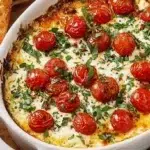 Creamy, cheesy Caprese dip loaded with roasted tomatoes and fresh basil, perfect for scooping with toasted bread.