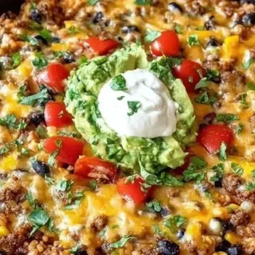 Cheesy Taco Rice Skillet is a quick stovetop meal that layers seasoned ground beef with canned beans, corn, salsa, and ready-to-heat rice. The final touch is shredded cheese melted on top, which ties the dish together with a creamy, savory finish. It tastes like a taco in a bowl: spiced beef, tender beans, burst of corn, and melted cheese that stretches with every scoop. The cooking method is simple browning and mixing in a skillet, so it has a relaxed weeknight vibe and a cozy comfort-food feel. It’s perfect for busy nights, potlucks, or casual family dinners.