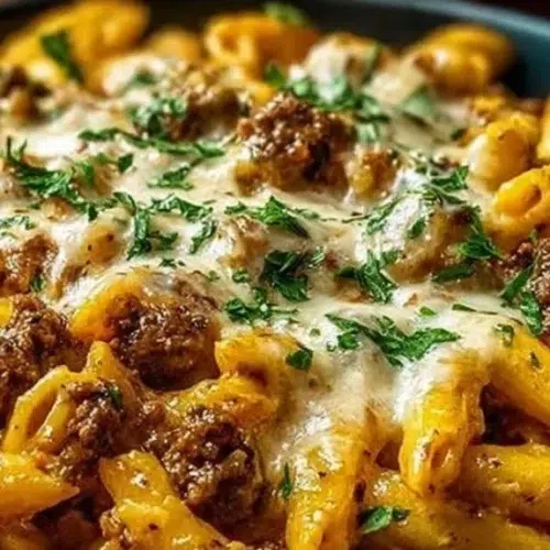 The cooking method is simple: boil the pasta until al dente, brown the beef in a skillet, add garlic, then stir in cream (or Greek yogurt) and grated cheese to make a sauce. Toss the cooked pasta in the skillet so the sauce evenly coats the noodles. The overall vibe is classic comfort food and it works perfectly as a quick weeknight meal or a casual family dinner.