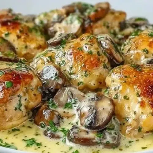 Succulent chicken thighs simmered in a creamy garlic mushroom sauce, perfect for a comforting weeknight dinner or cozy gathering.