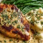 “Creamy garlic parmesan chicken breast” served over fluffy mashed potatoes with green beans on the side, all topped with a rich garlic-parmesan cream sauce and fresh chopped herbs.