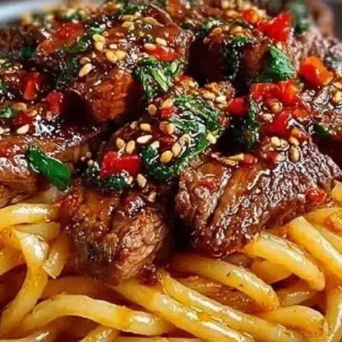 Sweet and Spicy Garlic Steak Pasta is a simple pasta dish that pairs seared steak pieces with a garlicky, soy-based sauce sweetened with honey or brown sugar and brightened with chili heat. The sauce is glossy and coats the pasta and steak, giving each forkful a balance of umami, sweetness, and spice. It’s made by searing bite-sized steak in a hot skillet, sautéing garlic briefly, adding the soy-honey-chili sauce, letting it reduce slightly, and tossing with cooked pasta. The vibe is honest comfort food — great for a fast weeknight meal, casual dinner with friends, or a cozy weekend plate when you want flavor without fuss.