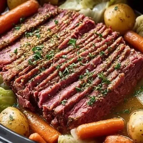 A tender corned beef brisket slow-cooked with potatoes, carrots, and wedges of cabbage makes a classic, comforting one-pot meal that’s full of savory, slightly salty flavor and fork-tender texture. The meat stays juicy while the roots soak up the broth, and the cabbage softens into sweet, mellow bites — all with minimal hands-on time. This crockpot method is perfect for busy days or a relaxed weekend dinner; finish with a dollop of mustard for a bright contrast. If you enjoy slow-cooked beef, try a related comfort recipe like the slow-cooker beef and noodles recipe for another easy family-style meal.