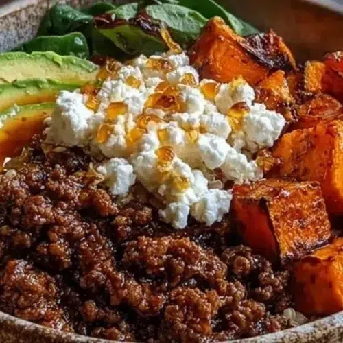 This High Protein Hot Honey Beef Bowl balances sweet heat, creamy tang, and earthy roasted sweet potatoes for a bowl that feels like comfort food with a protein punch. The ground beef glazed in hot honey gives sticky, savory bites; roasted sweet potatoes add soft, caramelized texture; cottage cheese brings cool creaminess while avocado adds silky richness. It’s fast to pull together and works great for a weeknight dinner, a filling lunch, or a simple meal-prep bowl. If you like hearty bowls, also try a similar idea with a burger-style twist by checking this recipe for high protein cheeseburger bowls.