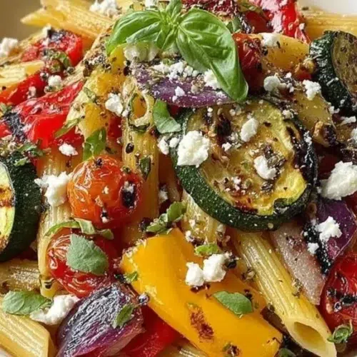 This is a pasta salad that leans on Mediterranean flavors — olive oil, balsamic vinegar, oregano, garlic, fresh basil, and salty feta — matched with grilled summer vegetables. It tastes smoky, tangy, and slightly sweet, with a fresh herb finish. The cooking method is simple: boil pasta to al dente, grill vegetables until they have charred marks and are tender, then toss everything together with a quick vinaigrette. The overall vibe is casual comfort food with a sunny, shareable feel — great for weeknight dinners, potluck side dishes, or a light lunch.