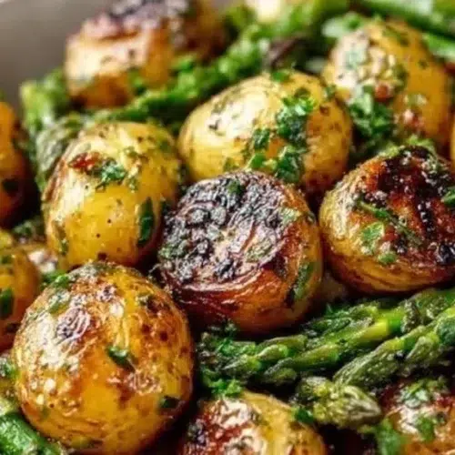 One-Pan Roasted Garlic Potatoes and Asparagus is a roasted vegetable dish that combines bite-sized potatoes flavored with minced garlic and dried herbs, roasted until crispy, then finished with fresh asparagus. The potatoes are crunchy on the outside and soft inside, while the asparagus keeps a tender snap and a light char. The cooking method is simple sheet-pan roasting: high heat to brown and crisp the potatoes, then a short finish with asparagus added in the final minutes. The overall vibe is comfort-forward but fresh — ideal for weeknights, casual dinners, and brunch spreads.