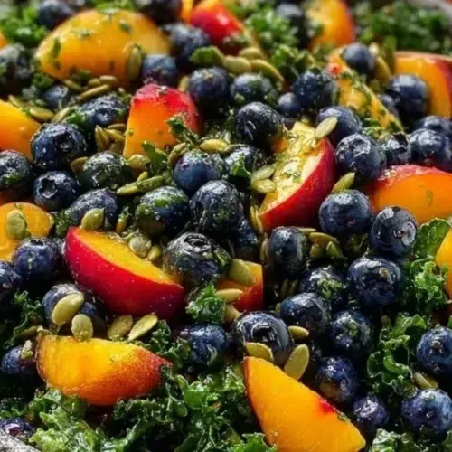 Peach Blueberry Kale Salad is a vibrant salad featuring a base of fresh green kale complemented by juicy peaches and blueberries. It is tossed in a light and zesty vinaigrette made with honey and lemon juice, making every bite a burst of flavor. The crispy pepitas add a satisfying crunch, enhancing the overall texture. This recipe is perfect for warm-weather meals, being both refreshing and filling without being heavy.