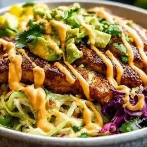 This dish is a deconstructed fish taco served as a bowl. Instead of tortillas, the slaw and mango salsa form the base and the seasoned fish sits on top. The taste mixes sweet mango, crisp cabbage, and bright lime with a smoky, creamy chipotle mayo. The fish is simply seasoned with salt, pepper, and olive oil and then grilled or baked until just cooked. The vibe is casual and fresh — think weeknight comfort with a healthy feel, picnic-ready, or a light dinner for guests. It feels like a taco without the taco shell, which keeps it low-carb and easy to eat with a fork.