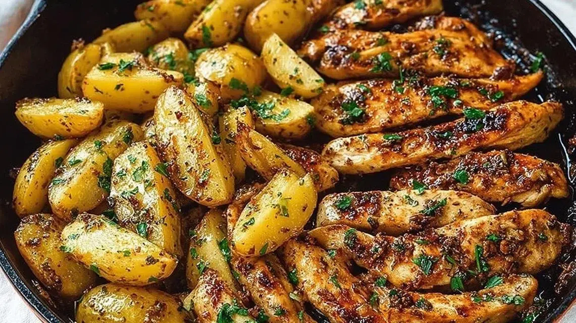 Garlic butter chicken and potatoes is a simple oven-finished skillet meal where seasoned chicken breasts are browned in garlic butter, then baked on a bed of halved baby potatoes. The taste is rich and savory from the butter and garlic, with a mild herb brightness if you add parsley. Texture mixes juicy, tender chicken with soft, buttery potatoes that have slightly crisp edges. This dish feels like classic comfort food but is easy enough for a weeknight. It’s cozy, home-style, and ideal when you want a single-dish meal that feeds a family without extra pots and pans.