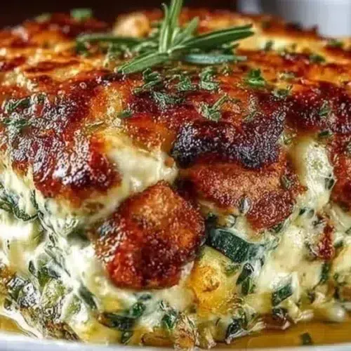 • Balanced textures: seared chicken, tender zucchini layers, creamy interior, melted cheese top.
