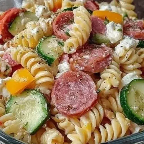 Follow the simple steps below. Cook the pasta, chop the veggies, mix the dressing, and toss everything together. Let it chill a bit so the flavors come together.