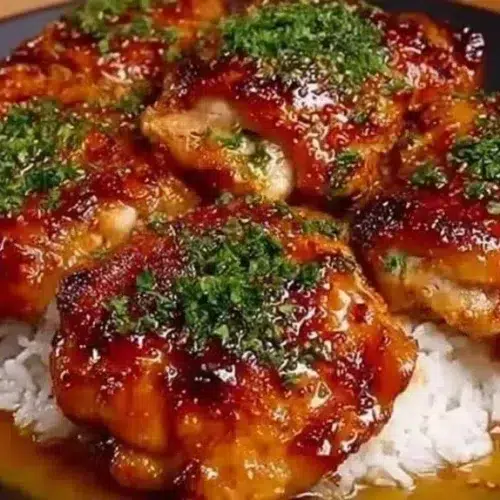 This dish features juicy chicken thighs marinated in a honey, garlic, lemon, and black pepper sauce, providing a sweet, tangy, and savory flavor profile with a beautifully caramelized glaze.