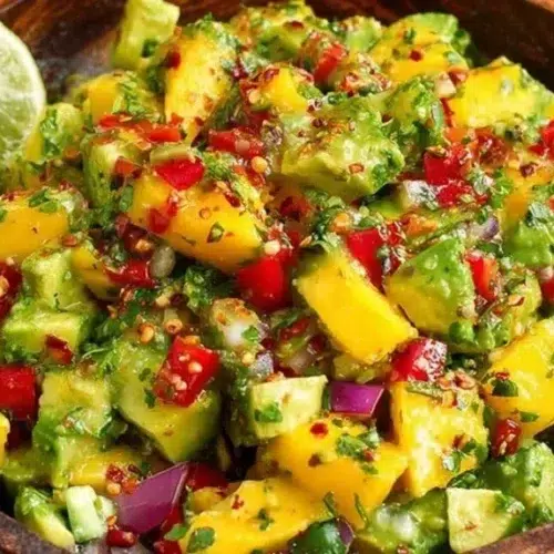 Mango Avocado Salad is a cold, tossed salad that highlights ripe mango and creamy avocado alongside crunchy vegetables and fresh herbs. It tastes sweet, creamy, and slightly tangy with a clean citrus lift. The texture is a mix of soft (avocado, mango) and crisp (capsicum, cucumber) with a little bite from red onion and heat from red chilli flakes. There is no cooking involved — just chopping and mixing — so it’s ideal for quick weeknights, light lunches, BBQ sides, or a fresh addition to a brunch spread. The vibe is casual, bright, and slightly tropical; it’s comfort food for warm days and a fresh pick-me-up any time.