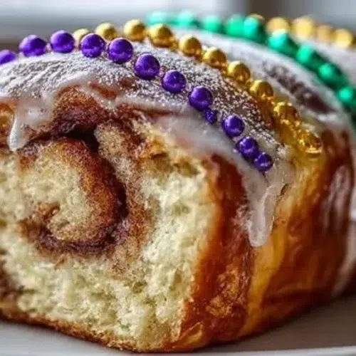 New Orleans style king cake is a sweet, enriched yeast bread shaped into a ring and decorated in Mardi Gras colors. This version has a cinnamon swirl filling — think of a giant, rolled cinnamon roll shaped into a crown. The taste combines buttery, slightly sweet dough with a sticky, spiced brown sugar layer. The outside bakes to a golden crust and the inside stays soft and tender. It’s baked in the oven (not fried) and has a cozy, comfort-food vibe that works for weekend brunches, holiday gatherings, or any festive morning. The cake feels celebratory but is simple enough for a weekday baking session if you plan rises the night before.