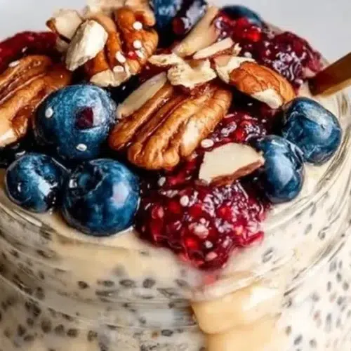 Overnight oats with chia seeds are creamy, slightly sweet, and wonderfully textured — soft oats meet the gel-like chia seeds and fresh fruit for a breakfast that feels both healthy and satisfying. The mix is cool, spoonable, and easy to dress up with berries, banana slices, nuts, or a smear of nut butter. This recipe is mostly hands-off: stir, chill, and wake up to ready-to-eat oats. Try serving it in a jar with layered berries for a pretty, grab-and-go breakfast or bring it to work in a tight-lidded container for a no-fuss meal. For a berry-forward take, compare it with this blueberry overnight oats recipe for ideas on fruit layering and texture.