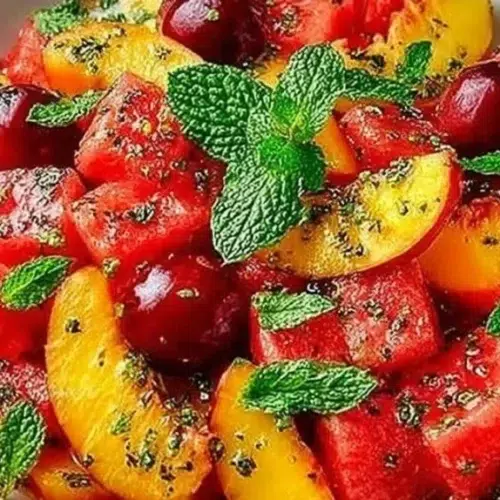 Peach and Watermelon Salad is a vibrant and refreshing dish that perfectly showcases the juicy sweetness of summer fruits. The combination of soft, succulent peaches and crisp watermelon creates a delightful contrast in texture, while fresh mint adds a burst of flavor and brightness. This salad is not only quick and easy to prepare but also incredibly versatile, making it a great option for any occasion. Serve it as a light starter at a summer barbecue, or pair it with grilled chicken for a wholesome meal.