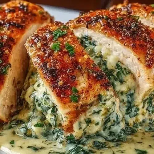 A tender chicken breast filled with a rich, creamy mixture of cheese, spinach, and garlic, seared and baked to perfection.