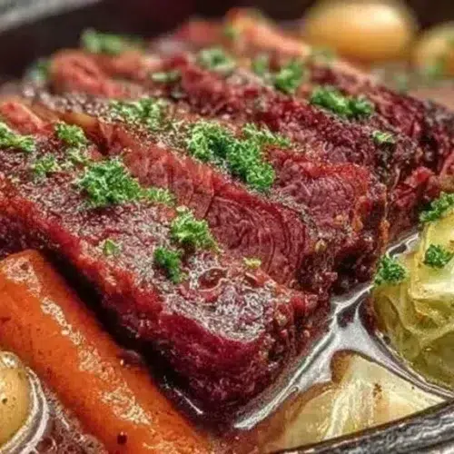 This recipe is a classic corned beef brisket cooked slowly with root vegetables and cabbage in a slow cooker. The meat is salty, beefy, and richly flavored from the brisket’s curing brine and pickling spices. The slow cooking softens the brisket until it’s easy to slice against the grain, and the vegetables absorb the savory broth for extra flavor. The cooking method is low-and-slow in a crockpot, which creates melt-in-your-mouth tenderness and a cozy, homey vibe—perfect for weeknight dinners, casual Sunday meals, holiday comfort, or a relaxed brunch with thick slices of meat and buttered potatoes.