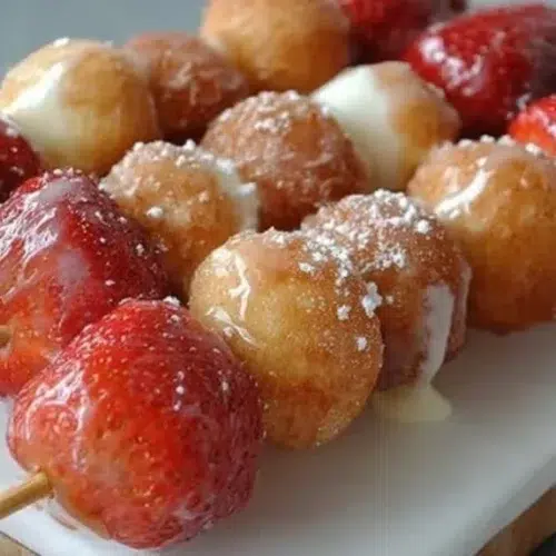 Strawberries and mini donuts make a fun, sweet combo that is bright, soft, and juicy. Each kabob pairs the tang and freshness of berries with the tender sweetness of a donut, so every bite has a mix of textures and flavors. This recipe is quick and simple — no oven, no frying — just thread and serve. It’s perfect for brunch plates, kid-friendly parties, or a quick dessert at the last minute. Try serving with a side of chocolate sauce or whipped cream for dipping to add a little extra treat.