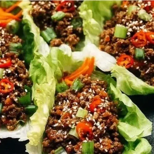 Ground Beef Lettuce Wraps are a simple, Asian-inspired handheld made by spooning a seasoned ground beef and vegetable mixture into whole lettuce leaves. The beef is browned in a skillet with garlic and ginger, then tossed with diced vegetables and a light sauce of soy sauce (or coconut aminos) and sesame oil. The taste is savory and slightly toasty from sesame oil, with bright notes from garlic and ginger and a hint of saltiness from the soy. The texture is juicy and tender from the cooked beef and soft vegetables, while the lettuce adds a crisp, refreshing crunch. The vibe is casual and weekday-friendly—comforting without being heavy—great for a quick family meal or a do-it-yourself appetizer platter.