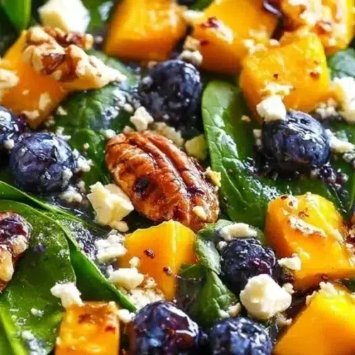 This salad is a fresh combination of chopped spinach, diced mango, whole blueberries, chopped walnuts, and crumbled feta. It blends sweet tropical notes from mango with the jammy pop of blueberries and balances them with salty, tangy feta and toasted walnut crunch. The dressing is a light vinaigrette made from olive oil, lemon juice, honey, and a touch of Dijon mustard for a mild bite. There’s no cooking involved—just chopping and tossing—so it’s perfect for weeknight dinners, quick lunches, potlucks, or summer brunches. The overall vibe is light, bright, and slightly elegant while still being simple and homey.